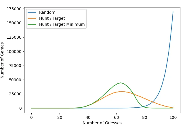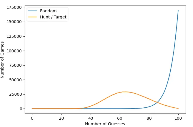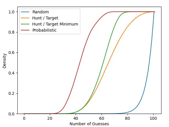 There are some marginal gains between the original and improved Hunt / Target strategy. Notably, the worst case for the original strategy is much worse than for the improved one. At worst, the original strategy hit all 100 squares, while the improved version never went past 88 squares.