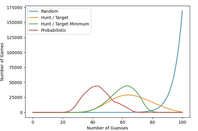 Battleship seems to be a pretty popular format to test a variety of AI strategies. Online you can find a wide array of approaches, from reinforcement learning to genetic algorithms to Monte Carlo methods. One of the most viewed pieces of media on the topic is a Youtube video by the channel Vsauce2. In the video, they describe a probability-based algorithm that leads to strategies far more sophisticated than a human player could reasonably use. That video led me to this blog post by Nick Berry of DataGenetics, who describes the algorithm in great detail. His post begins with a relatively weak algorithm, but he builds it into a powerful solution that can dramatically outperform many other methods. His explanation of the algorithm is brilliant, but I was unable to find any source code for his implementation. I decided to recreate his strategies and to post the source code publicly for anyone who wants to play around with or modify it. For those who want it, everything is available at my Github.